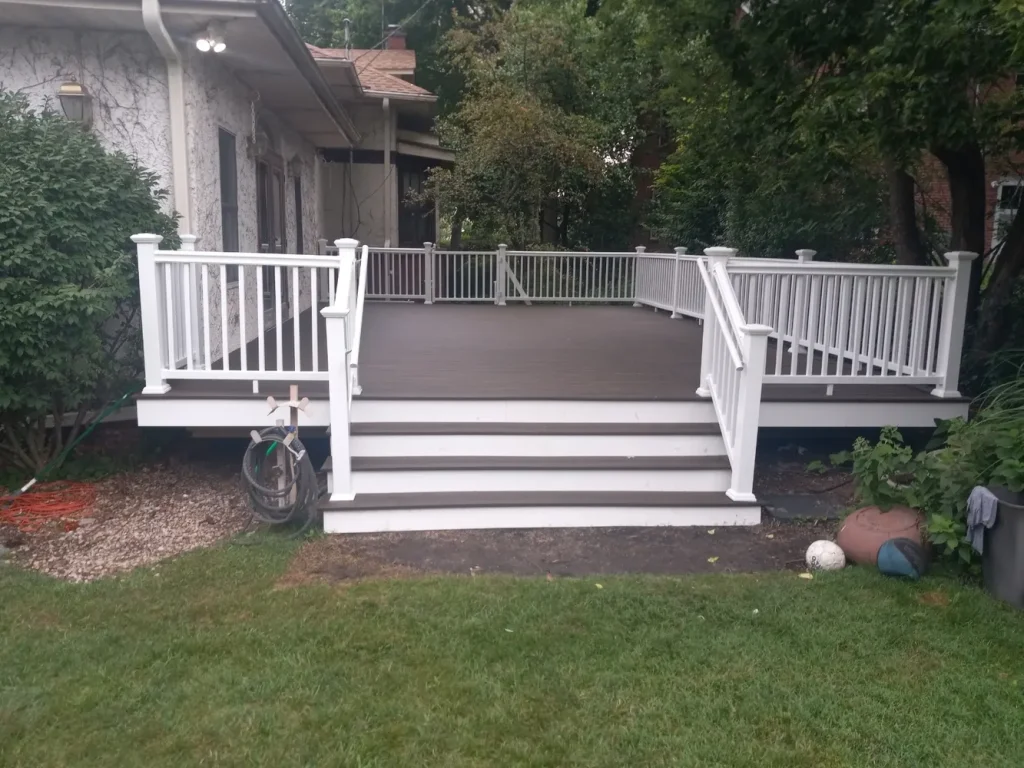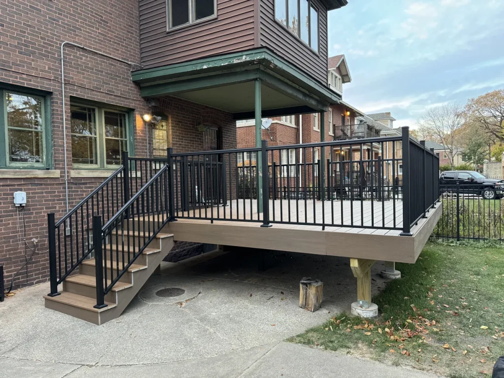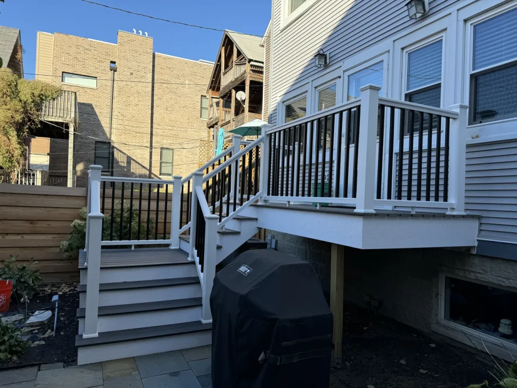 We built this elevated composite deck with sleek white railings and black balusters to create a modern outdoor space perfect for entertaining. Finished with a stone patio and privacy fencing, it’s a stylish upgrade for urban backyard living and a great example of our expertise in deck building near Chicago.