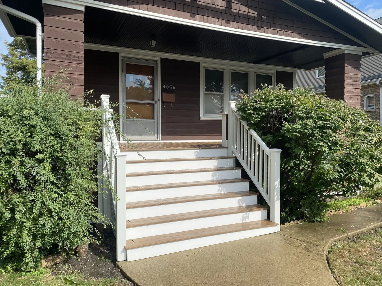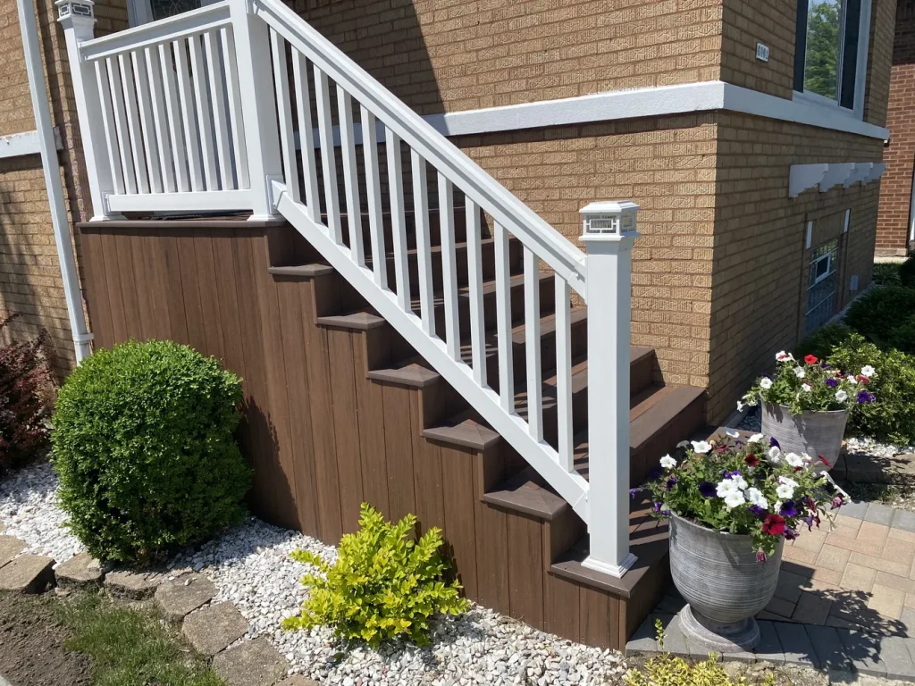 We designed and built this elegant front entry staircase using rich wood and crisp white railings to enhance the home’s curb appeal, complemented by clean landscaping and a welcoming walkway. Known for our expertise in deck building near Chicago, we bring the same perfect blend of function and style that elevates the entire façade.